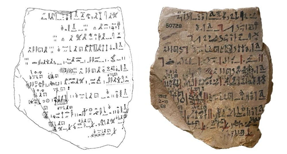 سنگ تراش ماسه سنگی که یادداشتی در مورد توزیع کوزه‌ها بین اعضای نیروی کار در دیر المدینه، مصر، اوایل سلسله نوزدهم، روی آن حک شده است.