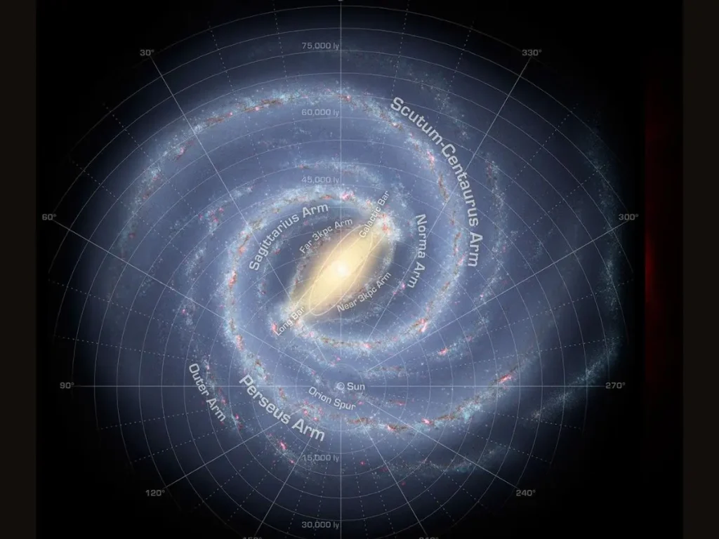 کهکشان راه شیری تقریباً ۱۰۰.۰۰۰ سال نوری قطر دارد و بیش از ۱۰۰ میلیارد ستاره را در خود جای داده است. زمین در یک بازوی مارپیچی به دور یکی از این ستارگان، یعنی خورشید، میچرخد. در مقایسه با جمعیت عظیم ستارگان، زمین به نقطهای کوچک و تقریباً بیاهمیت در کهکشانی پر از پیچیدگی و فعالیت تبدیل میشود.